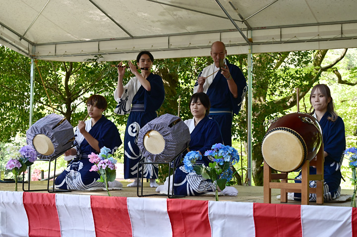 鳥居をくぐって一段上がると、お囃子の方々がチャンチキドンドンと演奏を披露していた。 GWの連休中はちょうど春の例大祭と重なるようで賑やかだ。 見ればときどき太鼓と笛の担当者が交代しており、一人で何役もこなせるマルチタレントであるらしい。