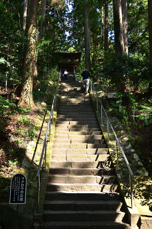 さて楼門をくぐるとフクロウの石段なる階段が続いている。96段でフクロウの語呂には無理がありそうな気もするが 「往復すれば2回通るので2x96=フクロウ」 というかなり強引な語呂合わせであるらしい(笑) 見上げれば本殿/拝殿がみえる。…まあ、ツッコミはほどほどにして、登ってみよう。