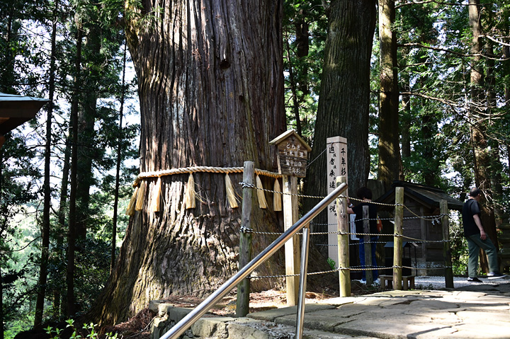 山頂は20m四方くらいの狭い領域で、摂社末社がひしめいて古木も多い。これは千年杉と呼ばれる古木で、注連縄があるからには御神木であるようだ。 説明書によれば直径2.2m、外周7m であるらしい。