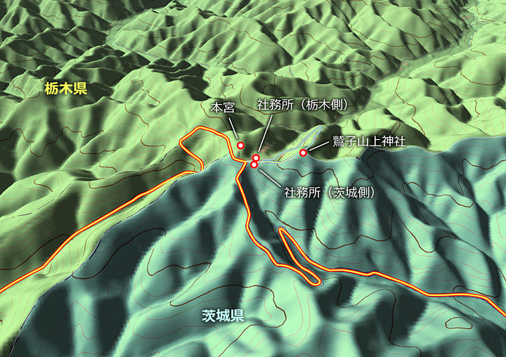 県境の状況はこんな感じで、かつては常陸国(茨城県)と下野国(栃木県)をつなく古道がここを通っていた。神社の建物にはいくらか変遷があり、元々は図中の本宮の位置に神社があり、戦国中期に現在の鷲子山上神社の社殿が建ち、のちにまた古い建屋の位置に本宮が改めて建立されている。