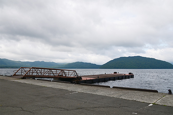 港は浮き桟橋がひとつだけのシンプル仕様だった。ドックはないようで、観光船の運用拠点は湖南岸の休屋地区の方にある。 ここはあくまでも一時寄港の場所ということで設備を軽めにしているようだ。