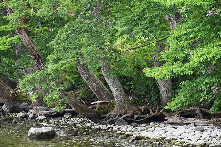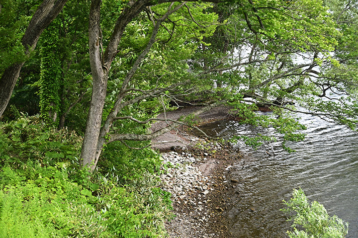岸辺には火山の噴出物らしい軽石や凝灰岩の破砕物が溜まっていて、土は木の根が掴んだわずかばかりの腐葉土がある程度だ。