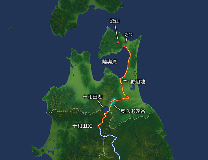 前半のハイライトとなる十和田湖~奥入瀬周辺は実はとても広い。自治体としての十和田市は東西40km、南北30kmほどもあって東京都23区よりも大きいのだが、これは十和田湖の東岸部に過ぎず、西岸部は秋田県の領域となっている。その秋田側を走る東北自動車道にはこれまた十和田ICというのがあるので、旅人は始終 "十和田" の名のついた標識を見ながら移動することになる。