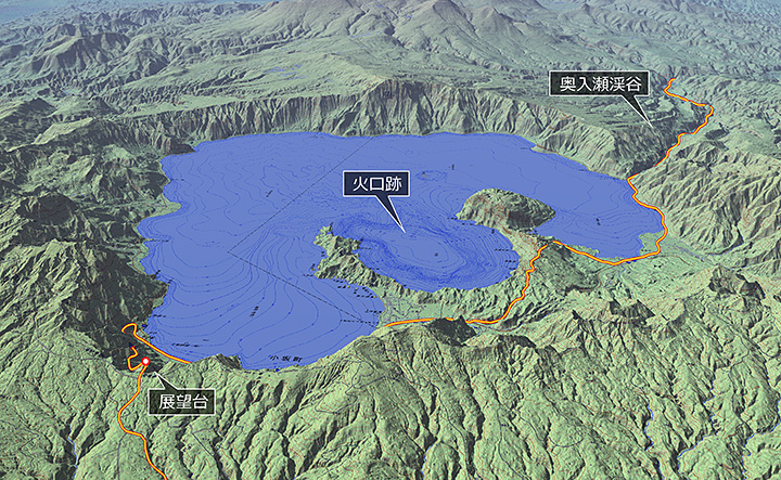 ためしに3D地図(↑)を起こしてみると、カルデラの様子がよくわかる。もともとは巨大な火山があって、あまりにも大量の噴出物を出した結果、内部が空洞になって陥没し、水が溜まったというものだ。平地はほとんどなく、土地も痩せていたため定住者はいなかった。ここは長らく山岳修験のフィールドで、 湖畔に人の集落が成立したのはなんと明治維新以降のことなのである。