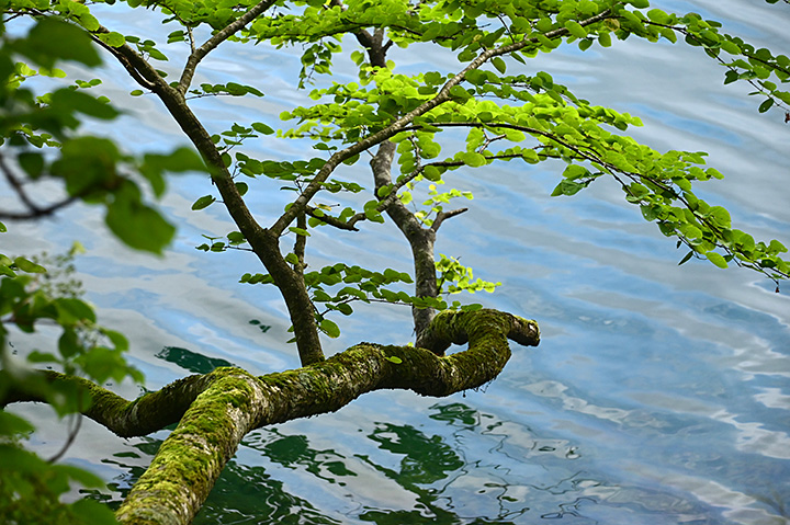 そんな訳で缶コーヒーをちびちびやりながら、周辺の様子をみてみる。湖岸の木々の根は僅かな土と石をしっかりと抱え込んでいる。火山地帯の宿命として、薄い表土にわずかばかりの地衣類が生えると、そこにへばりつくように樹木が育ち始め、根でがっしりと足元の土や石を包んでいく。この掴んだ土壌がその木の養分事情を決めてしまうので、木々も懸命に根を張っている。