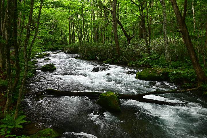 これは水門によって水量がコントロールされている福音のようにも思える。上流域の十和田湖周辺に大雨が降っても川が極端に増水することはなく、水辺の植物は水没しないぎりぎりの位置まで繁茂できる。 これが奥入瀬川の独特の景観を生んでいるのだ。