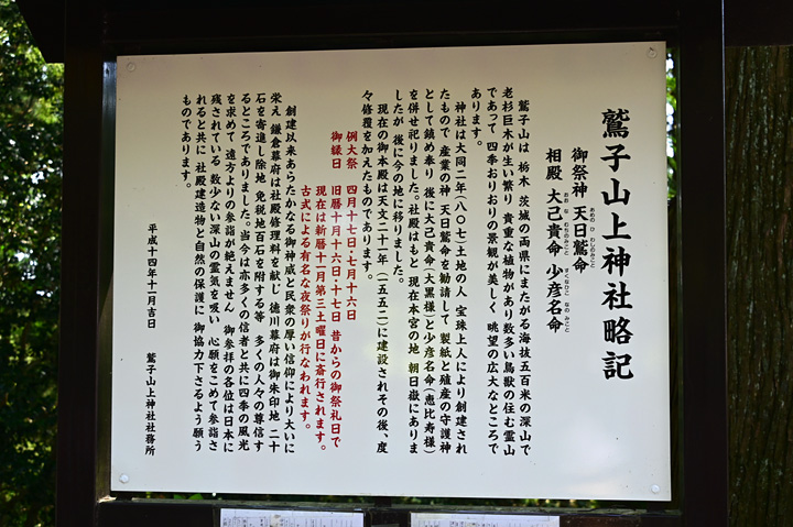 ではいよいよ神社の境内を歩いてみよう。 予備知識のない方はまず神社の名前の読み方も分からないかもしれない。ここは鷲子山上(とりのこさんしょう)神社という。