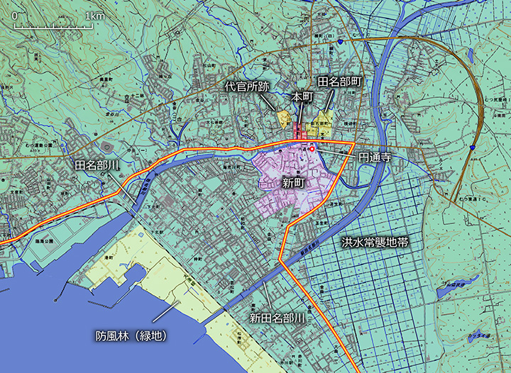 ※市内を流れる "新田名部川" は田名部川の氾濫を抑える為に昭和になってから造られた放水路で、南部藩時代には存在しない。