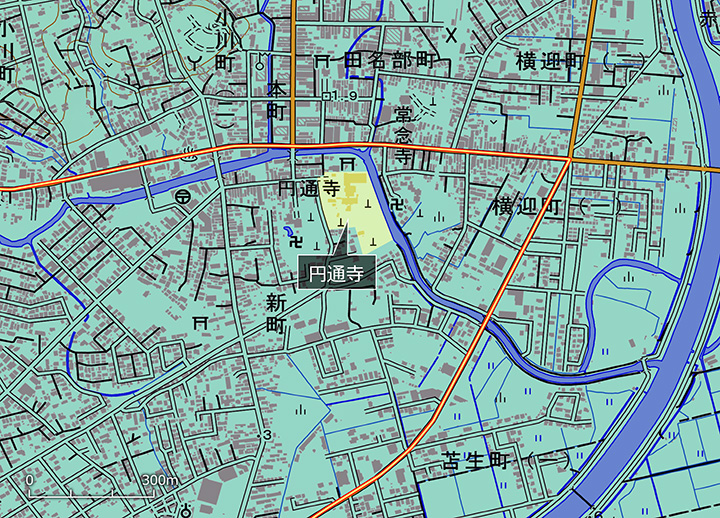 市街地をもうすこしアップで図示するとこんな感じになる。町を縦貫する田名部川を河口から4kmほど遡ったあたりに原初の街区と思われる田名部町/本町の名がみえる。 海沿いではなく川を数km遡ったところ、かつ川の湾曲部というのは鮭が遡上して産卵する場所の特徴でもあり、狩猟採集民が集落をつくるなら確かに合理性がありそうなところだ。 そうやって出来た蝦夷の集落がやがて和人と同化したと思えば筆者としては納得なのだが……実のところ、町の起源はよくわかっていない。