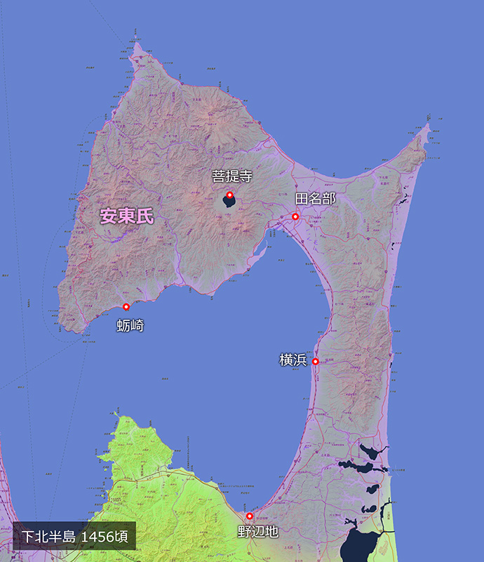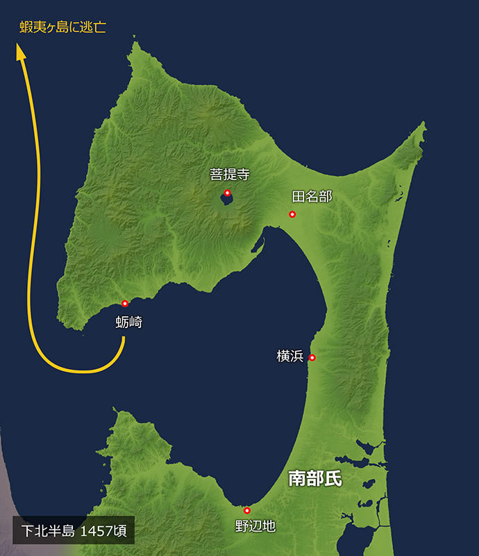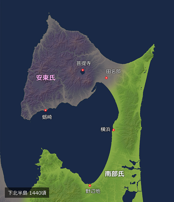 しかしやがて南部氏の反撃が始まり、トコロテン式に蛎崎氏(安東氏)の勢力は押し戻され、そればかりか居城のある蛎崎をも落とされてしまう。居場所のなくなった彼らは蝦夷ヶ島(北海道)に逃げ、ここで下北半島は全領域が南部氏のものとなった。逃亡した蛎崎氏はのちに蝦夷ヶ島で再起し、松前氏を名乗ることになるのだが、話し始めると長いのでそこは省略しよう。
