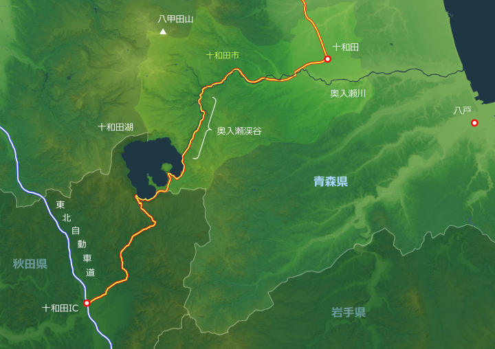 前半のハイライトとなる十和田湖~奥入瀬周辺は実はとても広い。自治体としての十和田市は東西40km、南北30kmほどもあって東京都23区よりも大きいのだが、これは十和田湖の東岸部に過ぎず、西岸部は秋田県の領域となっている。その秋田側を走る東北自動車道にはこれまた十和田ICというのがあるので、旅人は始終 "十和田" の名のついた標識を見ながら移動することになる。