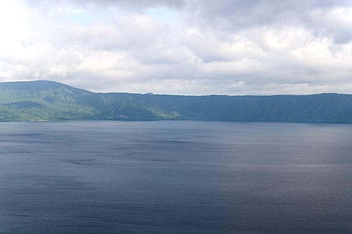 ちなみにここから湖畔まで降りていくルートはない。カルデラ外輪山の傾斜は非常にきつく、ここではほぼ垂直に切り立った崖があるばかりだ。湖面から筆者の立っているあたりまでの標高差はおよそ200m……50階建のビルくらいの高さがある。
