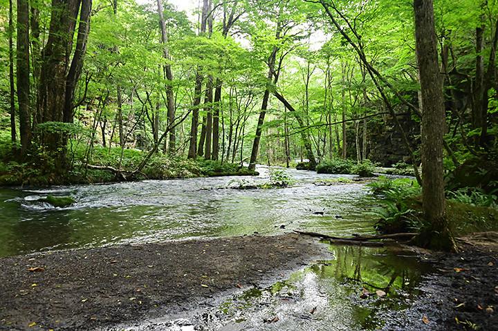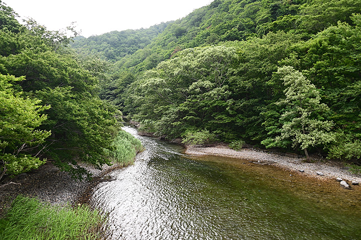 さて水門を過ぎると本格的な渓谷の風景が始まる。 あたりはブナやクヌギなどの広葉樹の森だ。青森県は冷涼な気候ではあるけれど針葉樹林体は少なく、植生は落葉広葉樹が多数派だ。秋になれば紅葉が美しそうなところだな。