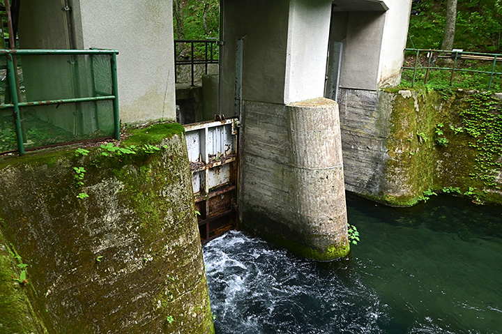これが水門本体である。季節毎、時間帯毎に流量を調整しており、夏季は昼間は毎秒5.56立方メートル、夜間は毎秒0.28立方メートルを流下させている。