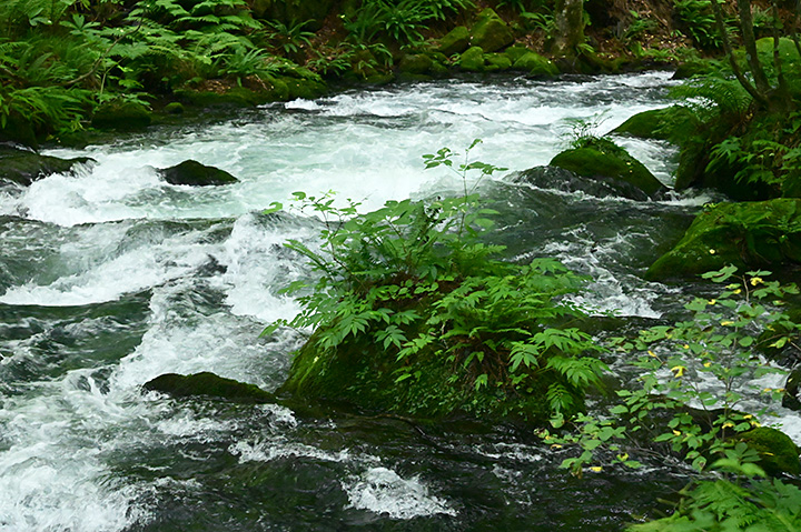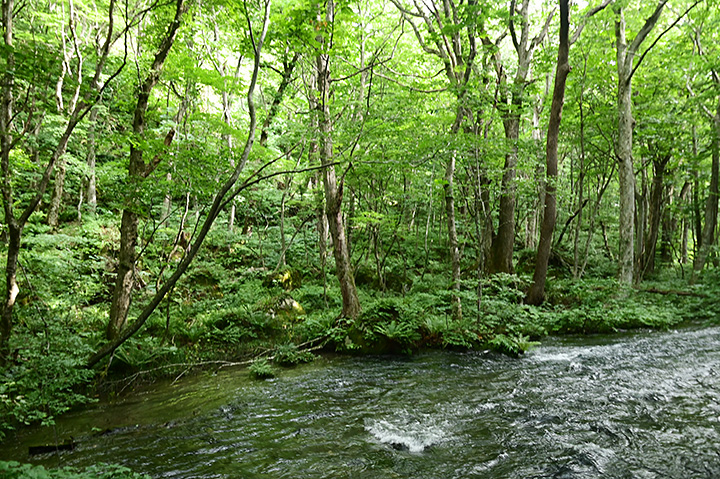 これは水門によって水量がコントロールされている福音のようにも思える。上流域の十和田湖周辺に大雨が降っても川が極端に増水することはなく、水辺の植物は水没しないぎりぎりの位置まで繁茂できる。 これが奥入瀬川の独特の景観を生んでいるのだ。